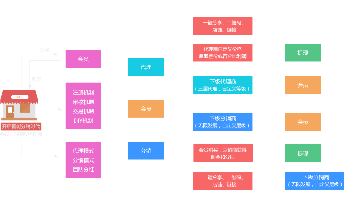 不同于传统代理模式,三层代理,无限自定义代理等级,创新代理模式,让客户与代理商之间相互转换,全新体验。