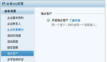 开启独占客户是指,如果初次访问的客户手动选择或被系统自动分配给了某个工号为其服务,那么该客户再次来访时,系统自动将其分流至之前为其提供服务的工号为其服务,其他工号无法主动向其发起会话。